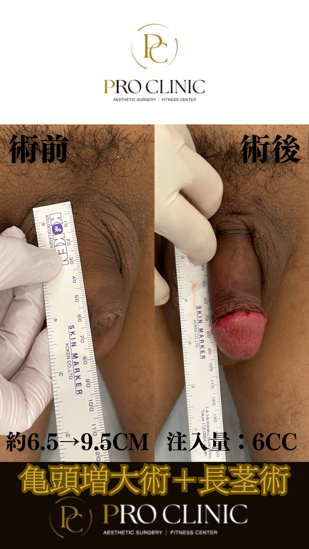 施術前は約6.5センチだった陰茎が、なんと9.5センチまで延長! 3センチもの伸長は決して一般的な結果ではなく、患者様の持つポテンシャルの高さが際立ちました。さらに、亀頭増大では当院で最も硬度の高い「ヒアルロン酸プロ」を6cc注入し、見た目の迫力はもちろん、しっかりとした硬さも実現。