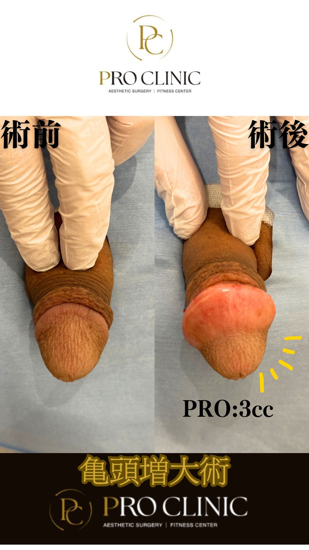 「術前と術後を比較すると一目瞭然。ヒアルロン酸PROの注入により、先細りだった亀頭がふっくらと立体的に進化しました。」