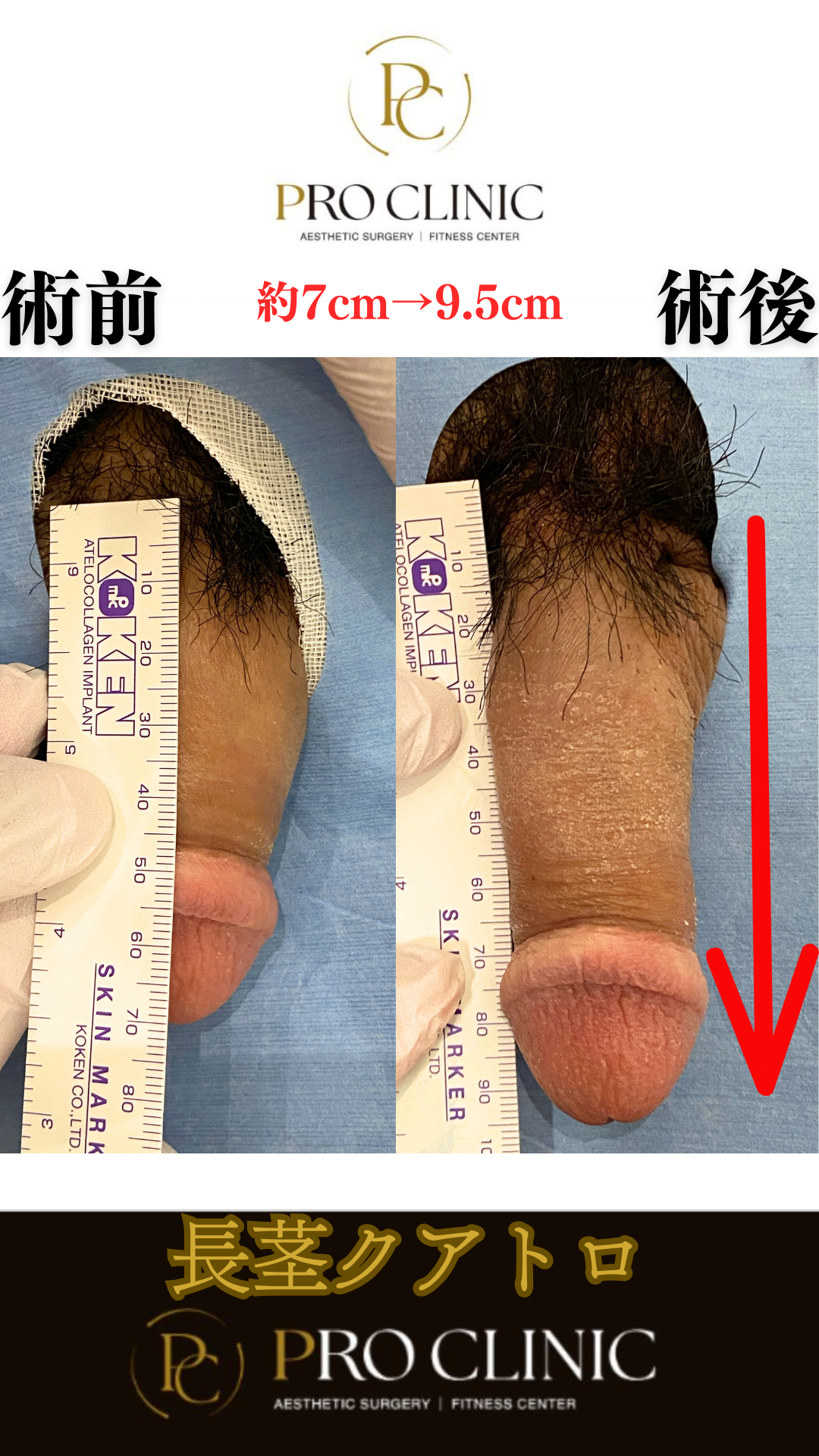 「長茎術クアトロによる陰茎の長さ改善ビフォーアフター。施術前約7cm→施術後約9.5cmへ。形成外科専門医による手術。」