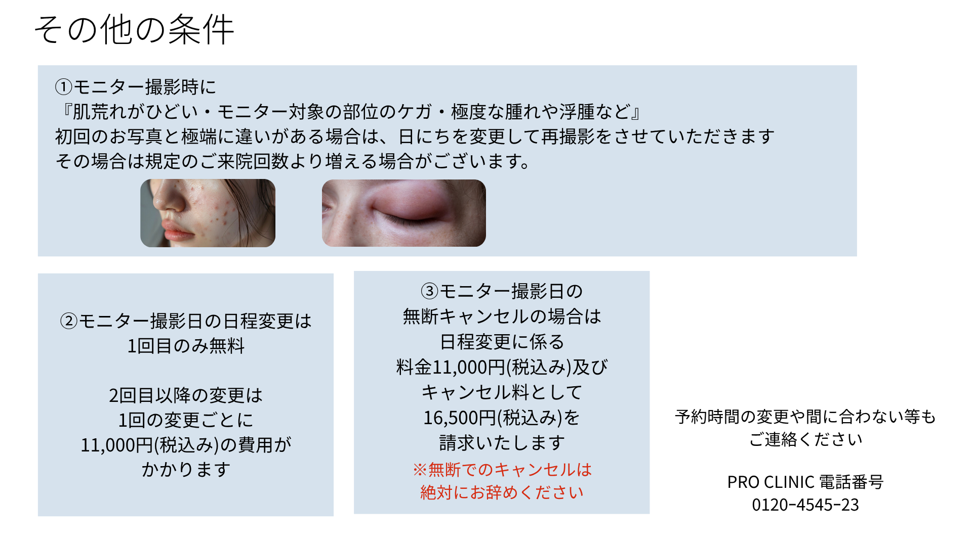 - 他院での施術: モニター対象部位に影響が出るような施術を、他のクリニックで受けること。