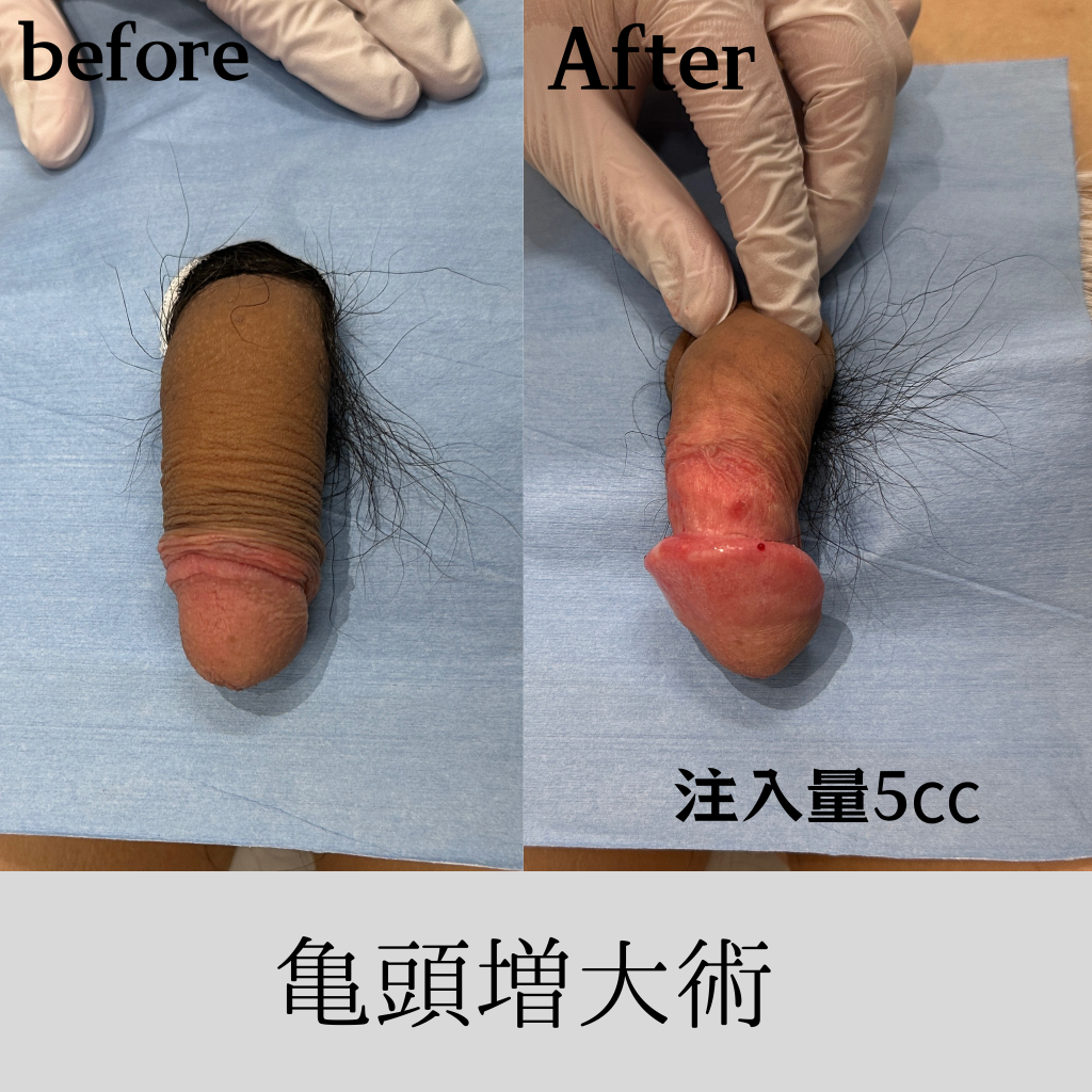 施術後は、ヒアルロン酸PROを5ccまで注入させていただきました!大幅な亀頭のサイズアップ感がお分かりだと思います。これまでに無い変化で患者様も大変ご満足のご様子でした。ぜひ今後の早漏の改善を実感していただけたら幸いです。このたびも当院をお選びいただき、誠にありがとうございました。スタッフ一同心より嬉しく思っております。今後もさらなる症例をご紹介してまいりますので、次回もぜひお楽しみにお待ちください!