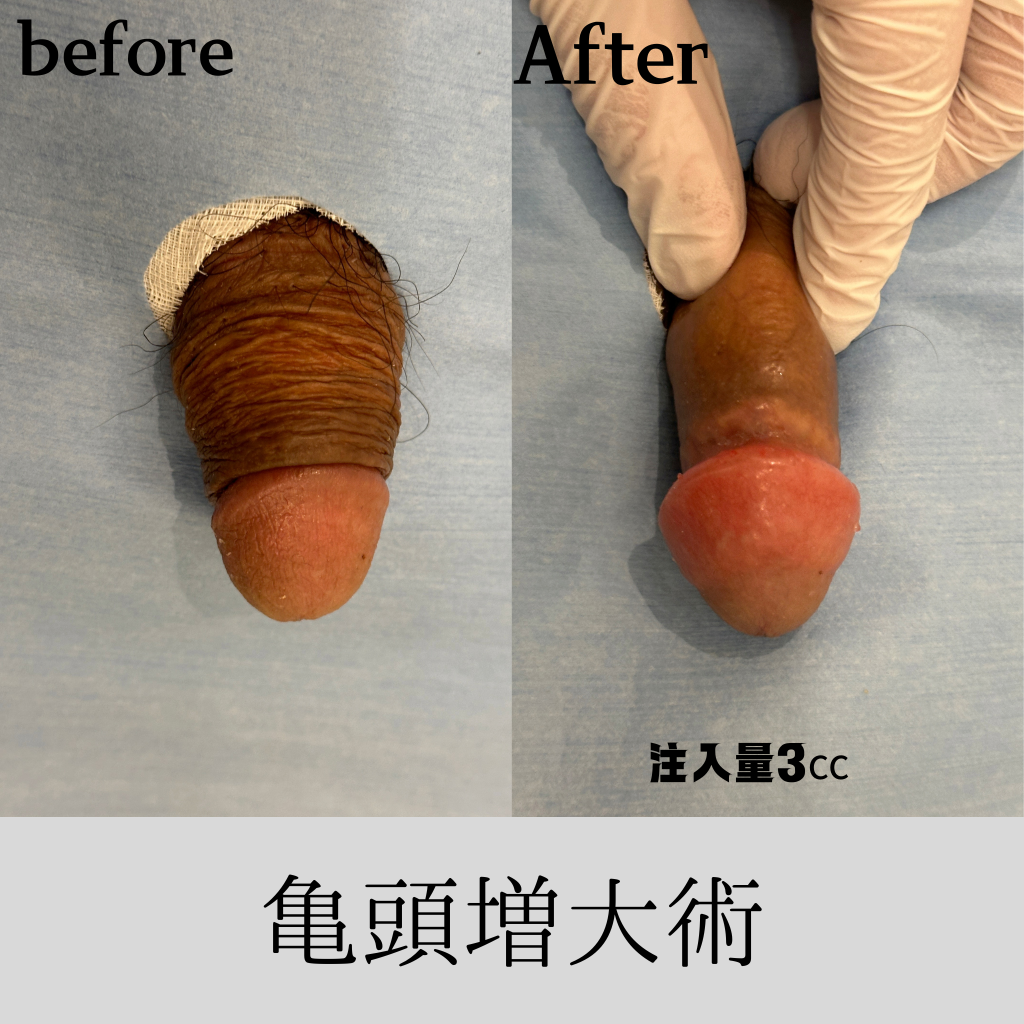 施術後は、小ぶりだった亀頭が大きく力強く際立ち、その存在感が格段にアップしました。特にカリ首の高さは一目で違いが分かるほど印象的です。今回は高品質なヒアルロン酸PROを3cc使用したため、硬さがしっかりと感じられるだけでなく、持続年数も通常の施術に比べて大幅に向上しています。これにより、さらなる満足感を得ていただけることと思います。今回も、患者様のお悩みを解消する手助けができて本当に嬉しいです。もし他に気になることがあれば、ぜひ当院へご相談ください。