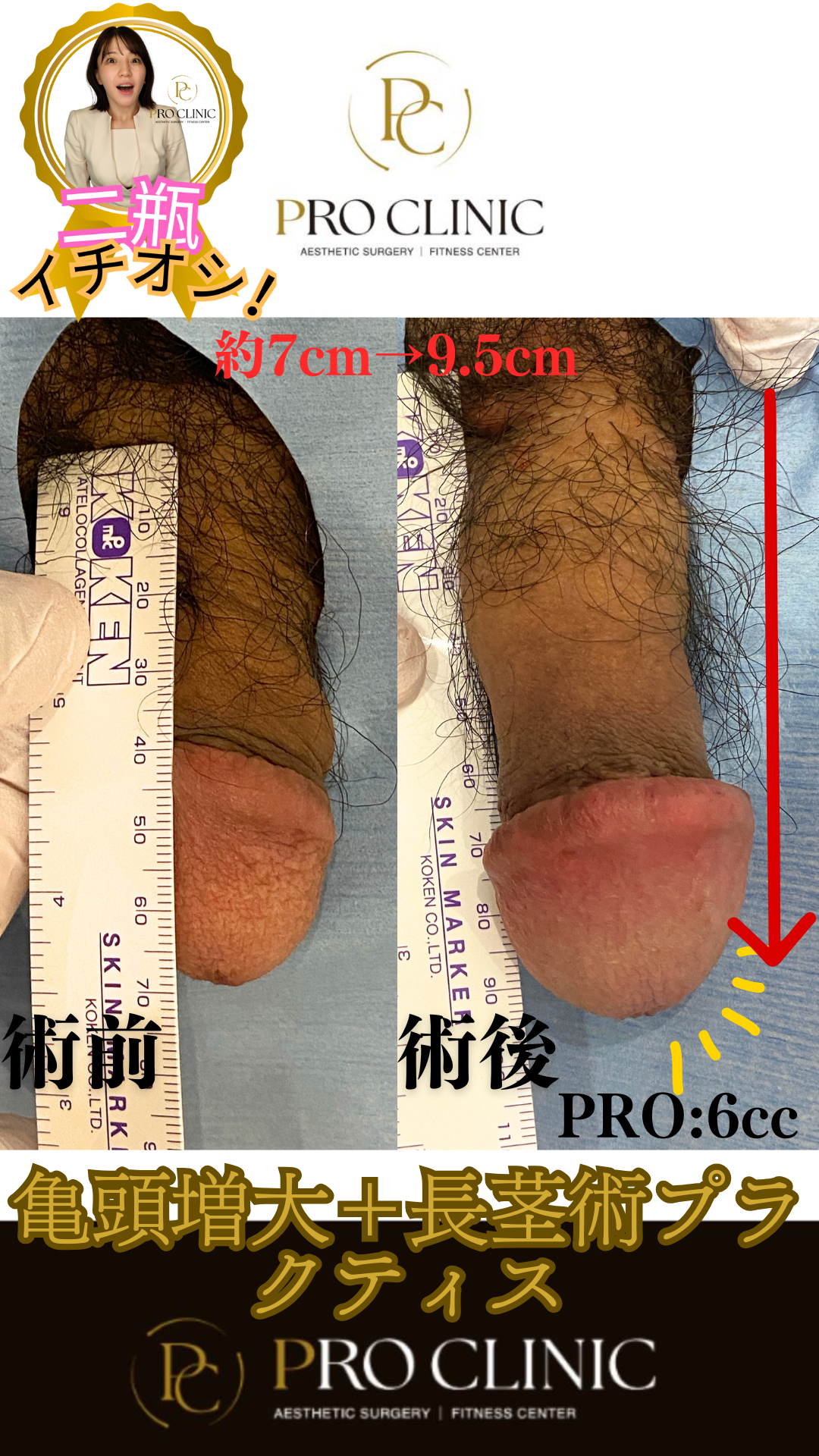 「長茎術とヒアルロン酸PRO 6cc注入で劇的変化!施術前後の違いが一目瞭然。」