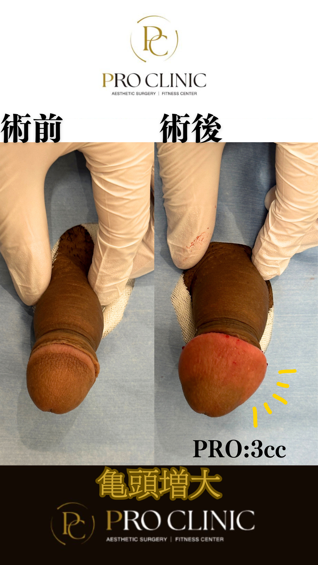 施術後は、ヒアルロン酸PROの効果により亀頭全体にしっかりとしたボリュームと硬さが加わり、目に見える変化をご実感いただけました。今回は亀頭全体のバランスを意識しながら、3ccを全周に均等に注入することで、自然で美しいフォルムを実現いたしました。