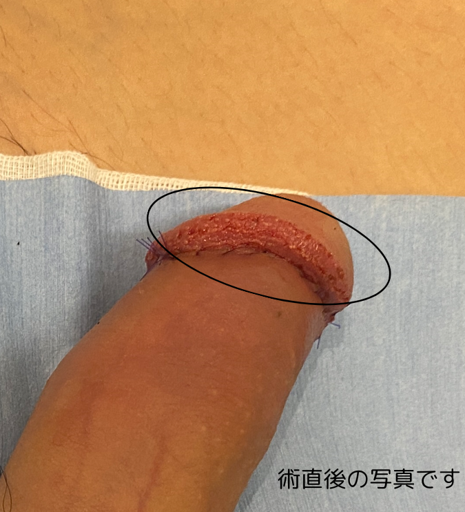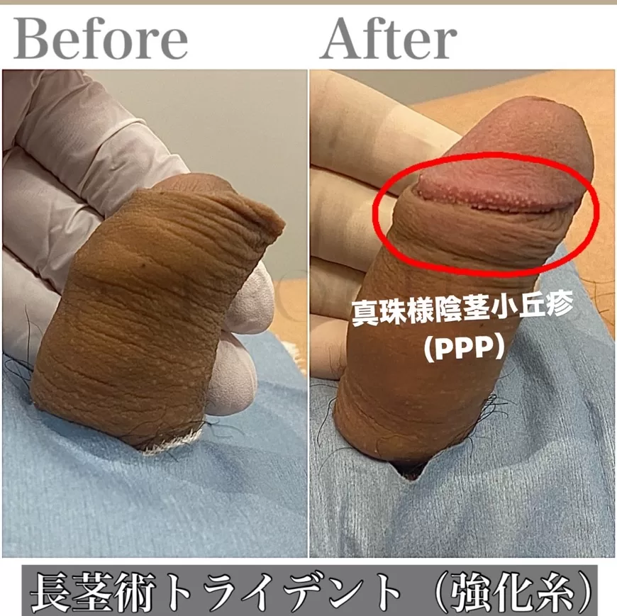施術の説明:包皮を切除し、亀頭直下に包皮断端を審美的に縫合し、包茎の治療を行っています。陰茎と骨盤をつなぐ「わな靭帯」を糸で固定し、骨盤側への引き込みを抑制することで陰茎の延長を図ります。合わせて、亀頭のぶつぶつ(PPP)除去も行なっております。