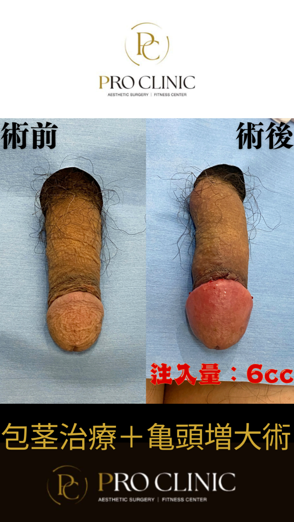 施術の説明:包皮を切除し、亀頭直下に包皮断端を審美的に縫合し、包茎の治療を行っています。また、亀頭へヒアルロン酸注入を行うことで見た目の改善を図ります。