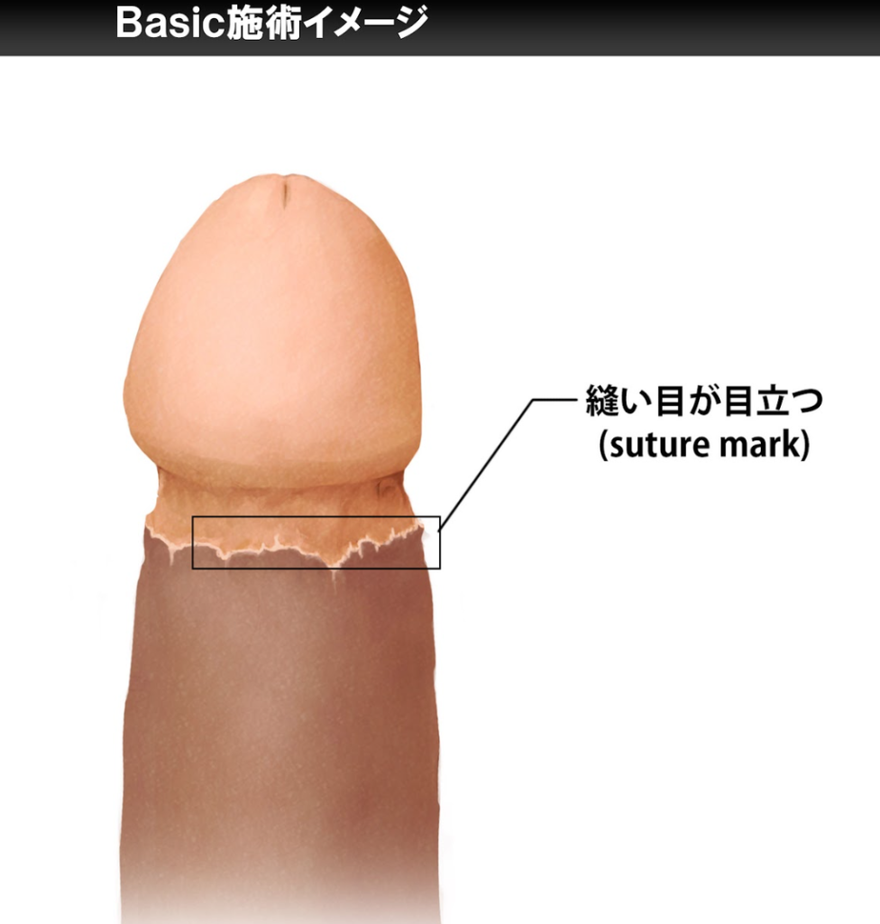 特徴として、切開の方法によりペニスが「ツートンカラー」になり、傷跡が目立ちやすいため、手術を行ったことが分かりやすいです。当院の3種類の中で,