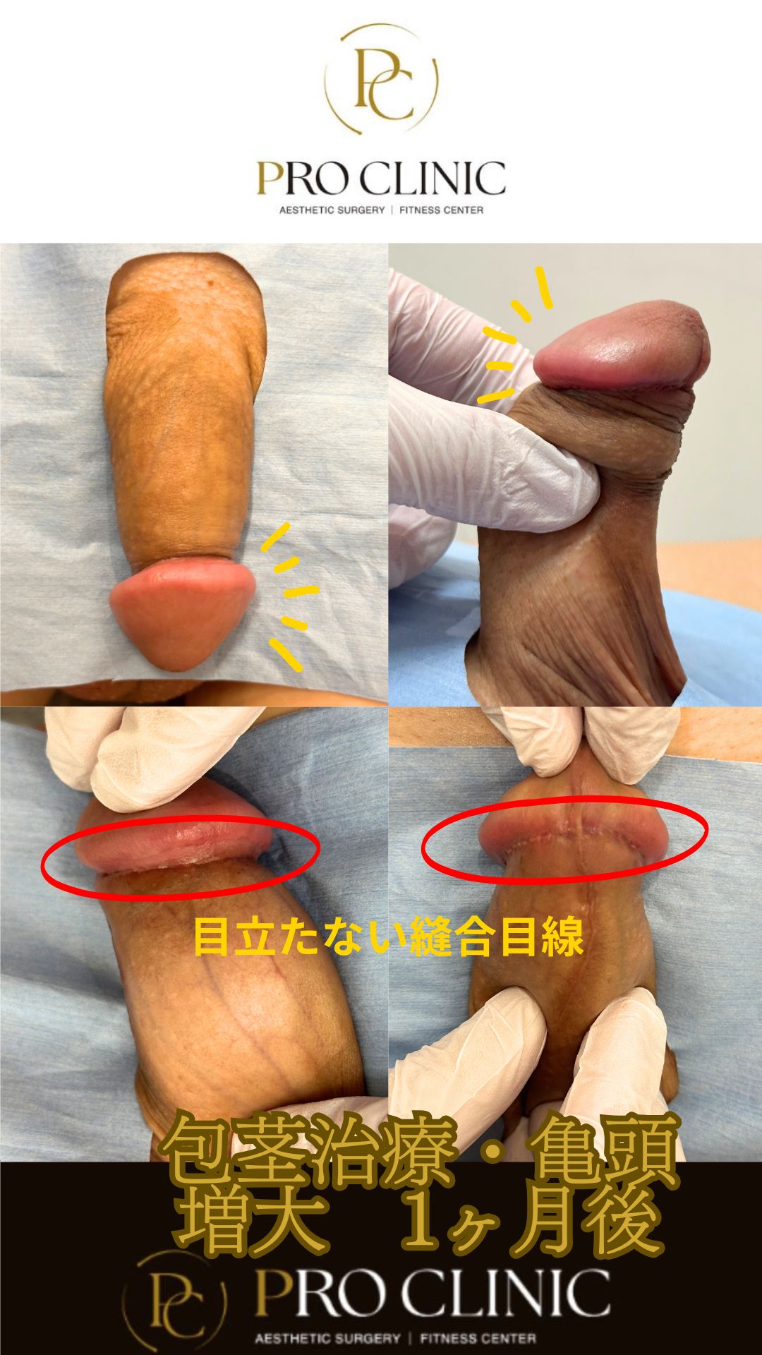 施術の説明:包皮を切除し、亀頭直下に包皮断端を審美的に縫合し、包茎の治療を行っています。また、亀頭へヒアルロン酸注入を行うことで見た目の改善を図ります。