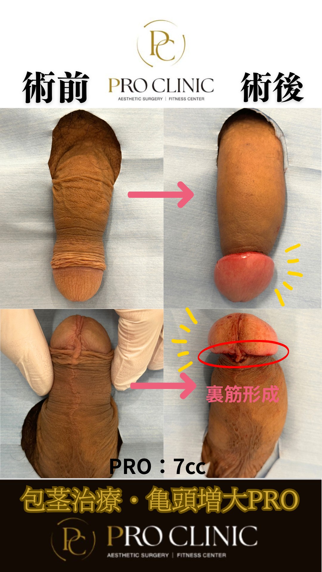 今回の患者様のご要望は「とにかく見た目をきれいに整えたい」という明確なものでした。そのため、裏筋形成を含む包茎治療PROと、硬質ヒアルロン酸PROを7cc使用した亀頭増大術を組み合わせ、自然かつ美しい陰茎へと導く高度な包茎治療をご提案いたしました。