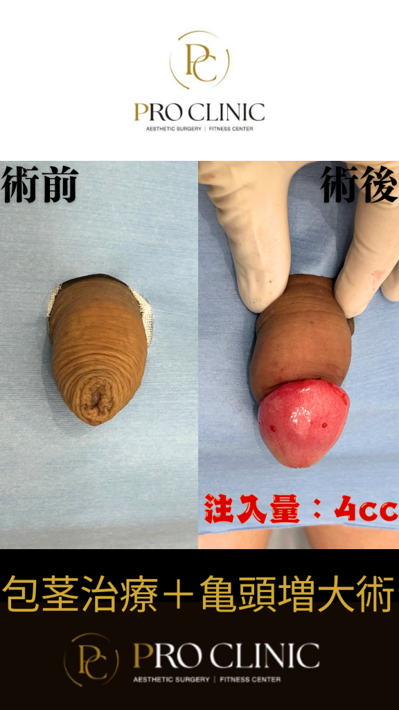 施術の説明:包皮を切除し、亀頭直下に包皮断端を審美的に縫合し、包茎の治療を行っています。また、亀頭へヒアルロン酸注入を行うことで見た目の改善を図ります。