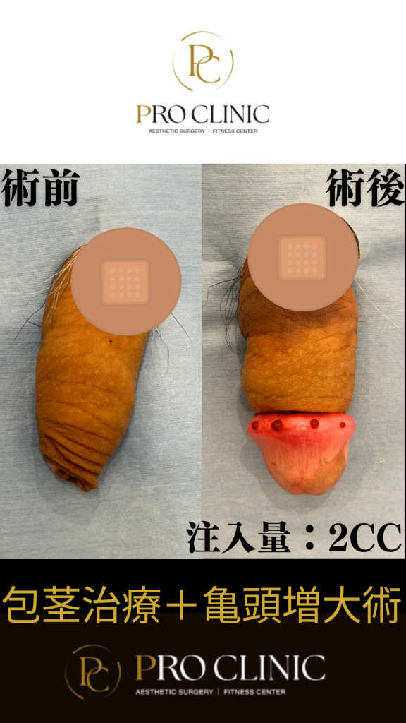 施術の説明:包皮を切除し、亀頭直下に包皮断端を審美的に縫合し、包茎の治療を行っています。また、亀頭へヒアルロン酸注入を行うことで見た目の改善を図ります。