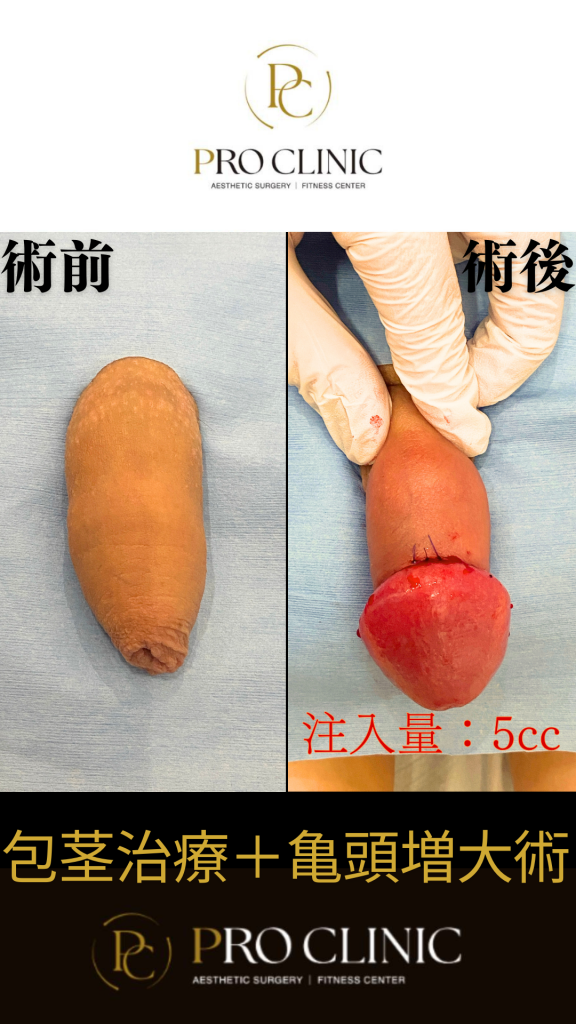 施術の説明:包皮を切除し、亀頭直下に包皮断端を審美的に縫合し、包茎の治療を行っています。また、亀頭へヒアルロン酸注入を行うことで見た目の改善を図ります。