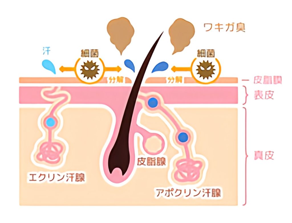 汗を分泌する汗腺にはエクリン汗腺とアポクリン汗腺の2種類に大別され、ほぼ全身に存在し体温調節のために発汗しする汗腺をエクリン汗腺、ワキや陰部など身体の限られた部位に存在しニオイの元となる物質を含む汗を分泌するものをアポクリン汗腺といいます。