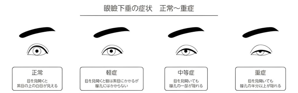 まぶたが下がってしまうことで視野が狭くなり、特に上方向の視界が制限されます。 - 頭痛や肩こり