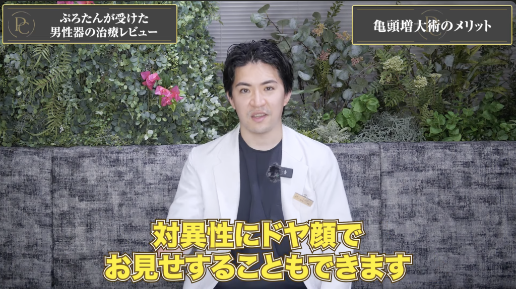 次に、ぷろたんさんが受けた「亀頭増大術」についてです。この施術では、亀頭の「カリ」の部分にヒアルロン酸を注入して、亀頭を美しくボリュームアップします。ヒアルロン酸注入は非常に速く、施術時間はわずか5分程度。即効性があり、見た目も即座に改善されるため、温泉やサウナで堂々と自信を持って行動できるようになります。