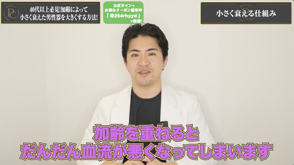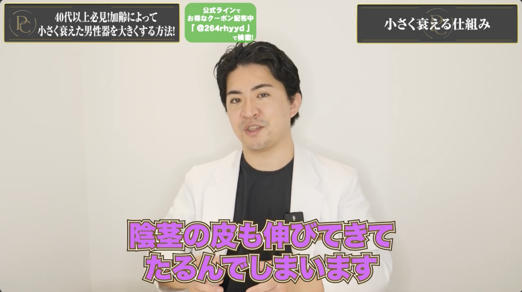 陰茎の皮膚は薄く柔軟ですが、加齢や繰り返しの伸縮によって次第に弾力を失い、たるみが生じます。その結果、亀頭の露出が減り、男性器全体が小さく見える原因となります。特に、10代から始まるこの変化は、30代~40代で目立ち始める傾向があります。