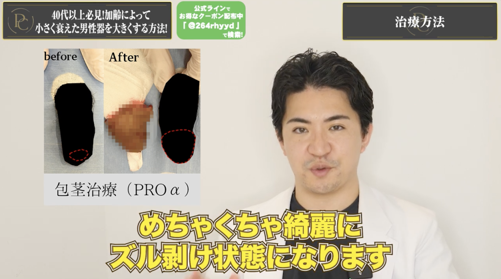当院の公式LINEでは、方形治療や亀頭増大術に関するお得な情報を発信中です。また、症例写真(モザイクなし)をホームページで多数公開しておりますので、気になる方はぜひ概要欄からチェックしてください。