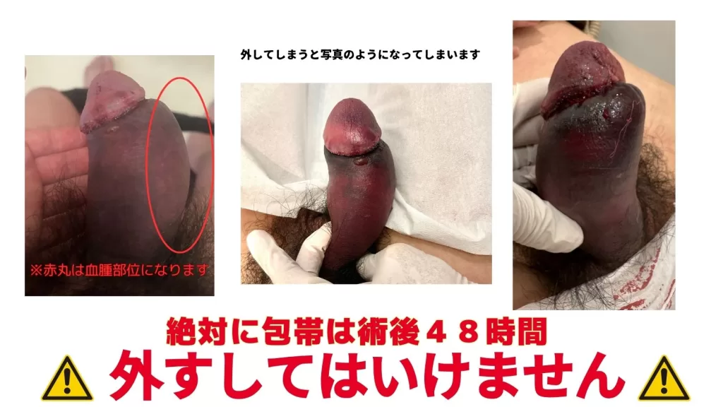 と啓発活動を行っておりますが、出血が気になってしまったり、手術部位が気になってしまったり、かっこよくなったペニスを見たいなー等で包帯を外してしまう方が多くいらっしゃいます。