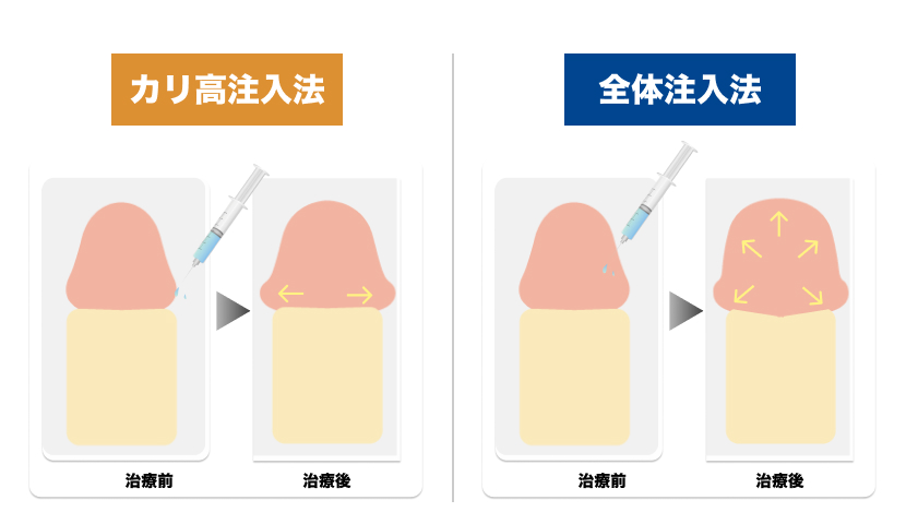 - 亀頭増大手術には、カリ高注入法や全体注入法があり、それぞれに適した効果や目的がある