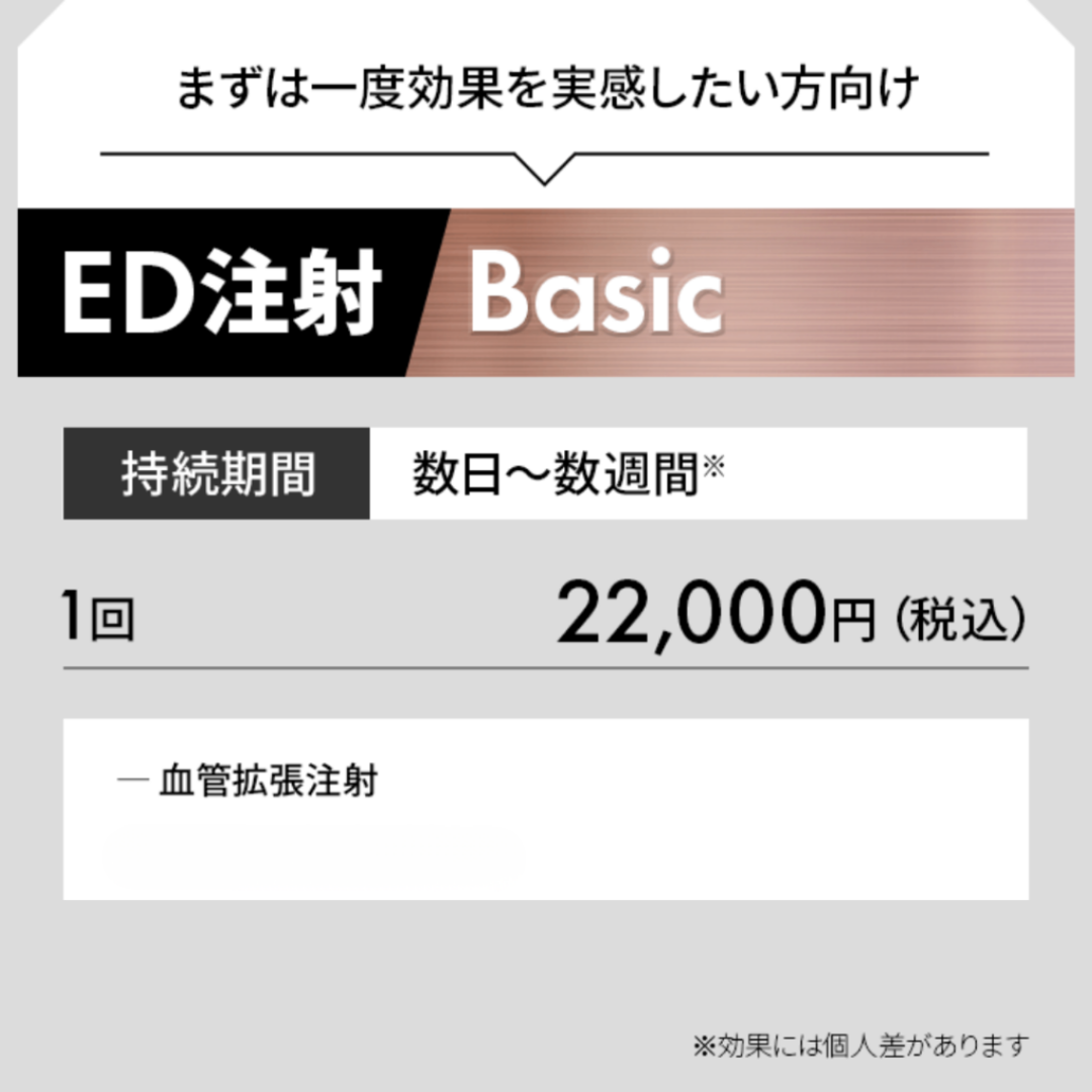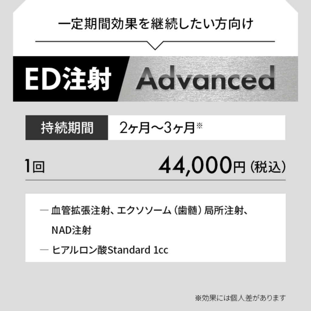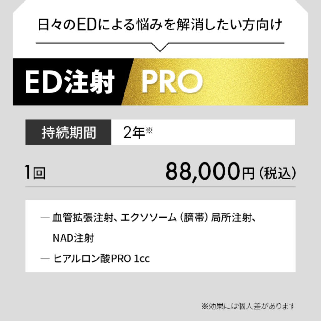 日本初の根本治療型ED注射とは?内服薬に頼らず勃起力を回復する最新治療を徹底解説 こんにちは。プロクリニックの男性器専門看護師、田中です。 今回は、多くの男性が悩む ED(勃起不全) に対する最新の治療法、ED治療注射 について詳しく解説します。 従来のED治療は バイアグラ・レビトラ・シアリス といった内服薬が中心でしたが、これらはあくまで対症療法でした。内服の煩雑さや飲み忘れを解消し、最も重要であるEDの根本治療に焦点をあて、当院では、2025年に日本初の根本治療型ED注射を開発し、延べ数百人の患者様が効果を実感されています。本稿では、ED治療注射の詳しい内容と実際の患者様の声をご紹介しながら解説してまいります。 🔍従来のED治療薬とED治療注射の違い ED薬3種類とED治療注射の違いを解説する表の画像。プロクリニックのロゴと看護師たーなーのキャラクターが登場し、根本治療の注射がおすすめであることを示している。 内服薬(バイアグラ・レビトラ・シアリス) これまでの内服薬では、主に性行為前や最中での対症療法が中心でした。その特徴として、 一時的に血流を増やして勃起をサポート 効果は数時間のみで根本治療ではない 継続使用で効果が弱まる場合がある 持病や薬の飲み合わせによっては使用不可 このように効果はあくまでも一時的かつ短時間の持続に限られていました。 ED治療注射 注射治療では、来院という制約はあるものの、長期間かつ効果的な作用での改善を主軸にしています。 陰茎海綿体に直接作用し根本改善を目指す 血流促進のプロスタグランジン 細胞修復・血管新生作用のエクソソーム 代謝を活性化するNAD これらを形成外科専門医 柚崎院長が独自配合し、安全性と効果を最大化。 1回の施術で効果を実感でき、2週間〜1ヶ月に1回の治療で済むのが特徴です。 これまでの内服治療では、強制的に血管を拡張させて陰茎海綿体への血流を増やしていましたが、ED治療注射ではその人本来の勃起力を改善し、自然な形でのED治療を図ります。 ✅ED治療注射のメリット 薬に頼らない自然な勃起力の回復 食事やアルコールの影響を受けにくい 5分程度の短時間施術 内服薬が使えない方にも適応可能 1回の治療で長期的な持続効果が期待できる 来院しなければならない、施術に若干の痛み(採血と同程度)などの制約はあるものの、内服薬や持病などの阻害を受けにくく、多くの方々へ効果が期待できます。 👂実際の患者様の声 20代男性:「心理的EDに悩んでいたが、中折れがなくなり自信が戻った」 30代男性:「妻に指摘されていたが、注射後は勃起の硬さを実感できた」 40代男性:「朝勃ちが復活し、加齢の不安が解消」 50代男性:「持病でED薬が使えなかったが、20代の頃に戻った感覚」 60代男性:「薬の飲み合わせを気にせず治療でき、現役を続けられるのが嬉しい」 一部抜粋ですが、幅広い年齢層の方へ効果をご実感いただいております。 💉当院の治療プラン ED治療注射 PRO(最上位プラン) 88,000円(税込) プロスタグランジン+臍帯由来エクソソーム+NADを高純度配合。最も効果・満足度が高いプラン。 ED治療注射 Advanced 44,000円(税込) 歯髄由来エクソソームを使用し、コストパフォーマンスに優れたプラン。 ED治療注射 Basic 22,000円(税込) プロスタグランジンのみのシンプルなプラン。価格を抑えたい方向け。 ※ED治療薬や亀頭増大注入との併用も可能です。 例えば、翌日の朝立ちで大きな効果をご実感いただいている方もいる方もいれば、時間経過とともに徐々に効果をご実感いただく方も多いです。 🏥プロクリニックが選ばれる理由 慶應医学部卒・形成外科専門医 柚崎院長による専門治療 包茎手術や亀頭増大など 男性器治療の豊富な実績 完全個室・男性専門クリニック で安心の環境 医学的根拠に基づく治療と丁寧なアフターケア 当院では、多くの男性器治療の実績と経験が豊富な医師と看護師、カウンセラー一体となって患者様のお悩みに向き合っております。 ✨まとめ:ED治療で自信を取り戻す EDは性生活だけでなく、仕事や人間関係、人生の活力にも直結します。 「薬に頼らず自然な勃起を取り戻したい」 「内服薬が効かなくなってきた」 「持病でED薬が使えない」 そんな方にこそ、ED治療注射は有効な選択肢です。ぜひ一度ご相談ください。 ED治療とはまさに自信を取り戻すだけでなく、男性としてのアイデンティティを確立することでもあります。それが仕事や学業などを頑張る原動力になると信じており、私たちは男性の活力を改善し、社会がより明るくなることを使命と感じ治療を提供しております。 この記事の監修医師 柚崎一輝 (プロクリニック銀座院長) 慶應義塾大学医学部卒 / 日本形成外科学会認定 形成外科専門医 / 日本美容外科学会(JSAPS)正会員 / JSAN設立者・理事 当院は大手包茎クリニックに負けない技術力と 傷跡のスペシャリストが在籍しており、当院は 形成外科専門医 柚﨑医師の下日々努力を重ね、 尽力し患者様に安心して手術を受けられるよう