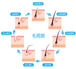 ●毛周期は主に成長期・退行期・休止期に区分されます。